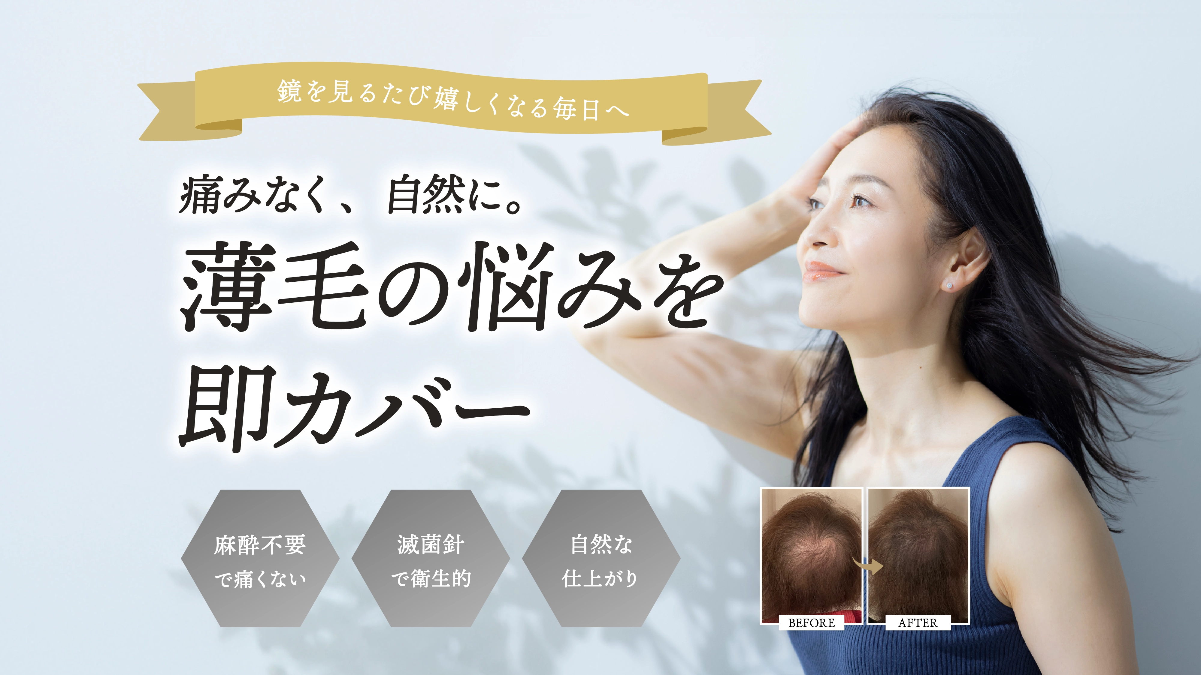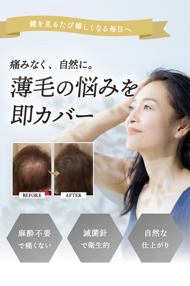 髪の陰影やボリューム感を自然に再現し、薄毛や地肌の目立ちを軽減します。